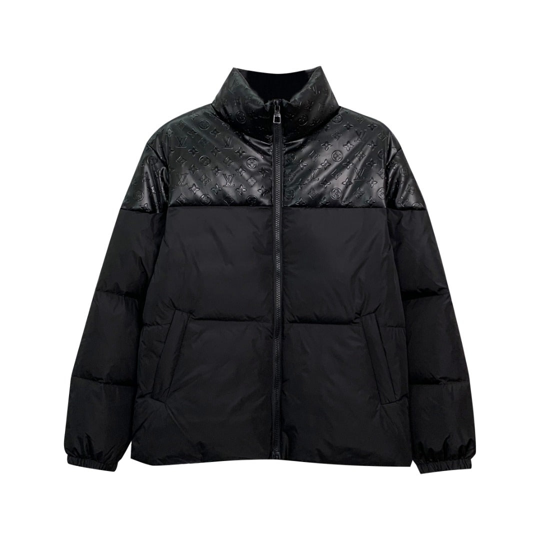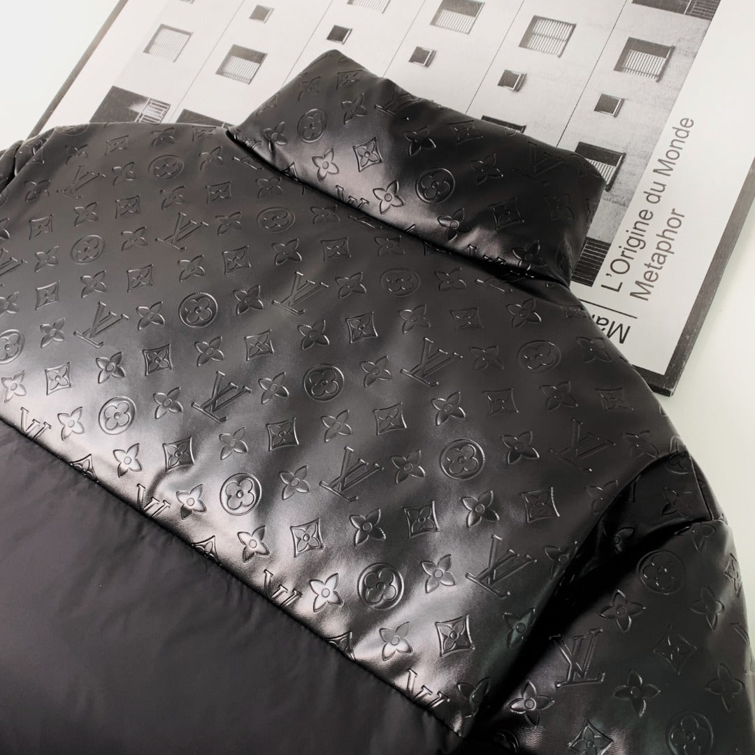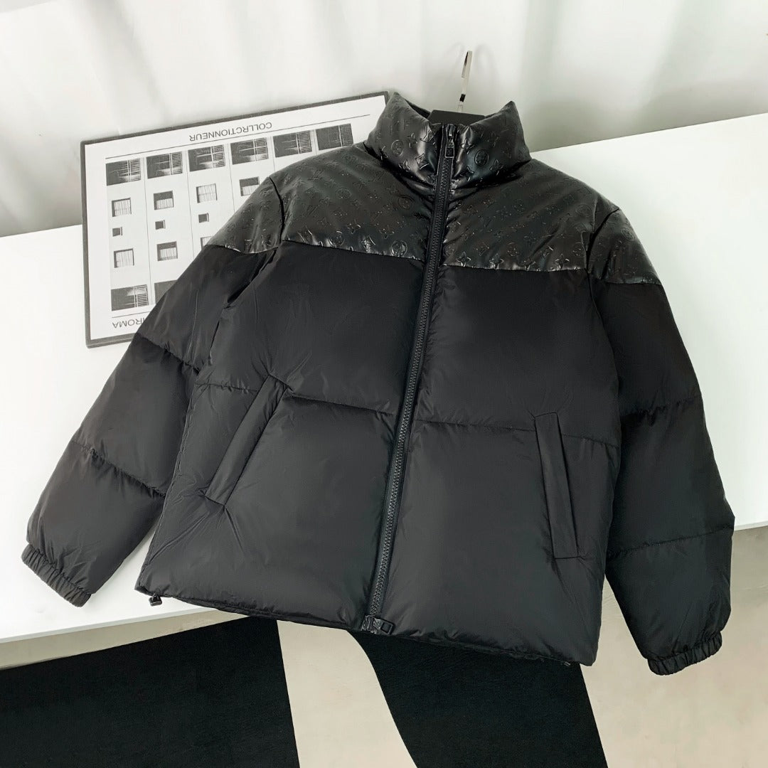 1102 New high quality embossed leather splicing stand collar down jacket